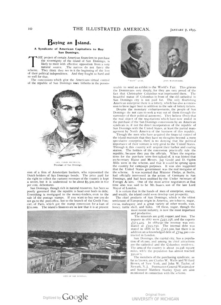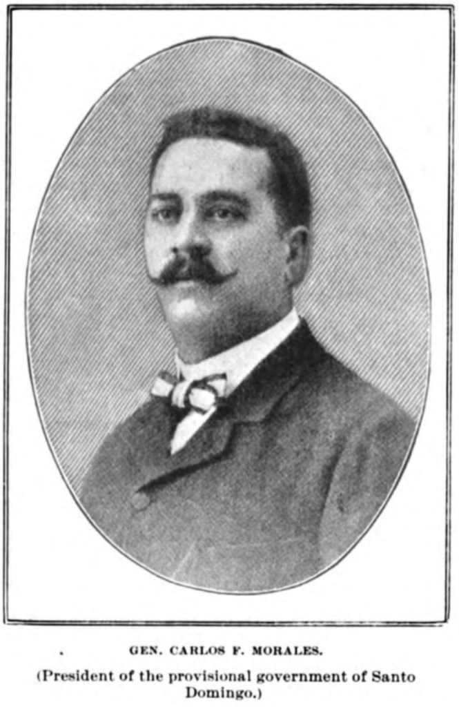 Si bien resulta singular que ésta magnífica isla tropical, con una superficie de 28,249 millas cuadradas, situada equidistante entre las islas de Cuba y Puerto Rico, haya progresado menos y sea menos conocida hoy que cualquier otra parte del hemisferio occidental, las razones que han causado la falta de desarrollo de este país maravillosamente fértil y productivo se ven, por fin, superadas gracias al establecimiento de un gobierno nuevo, fuerte e inteligente, bajo la presidencia de Morales, y a la cooperación positiva y activa del Gobierno de los Estados Unidos con la actual Administración de Santo Domingo *. Los funcionarios de ésta administración son plenamente conscientes de las excepcionales oportunidades que ofrece el capital estadounidense en ese país. Éstas nuevas condiciones garantizan el cese de las disensiones políticas, una era de prosperidad permanente y un desarrollo inmediato de sus recursos naturales y de otra índole, sin parangón en ningún otro país del mundo.*